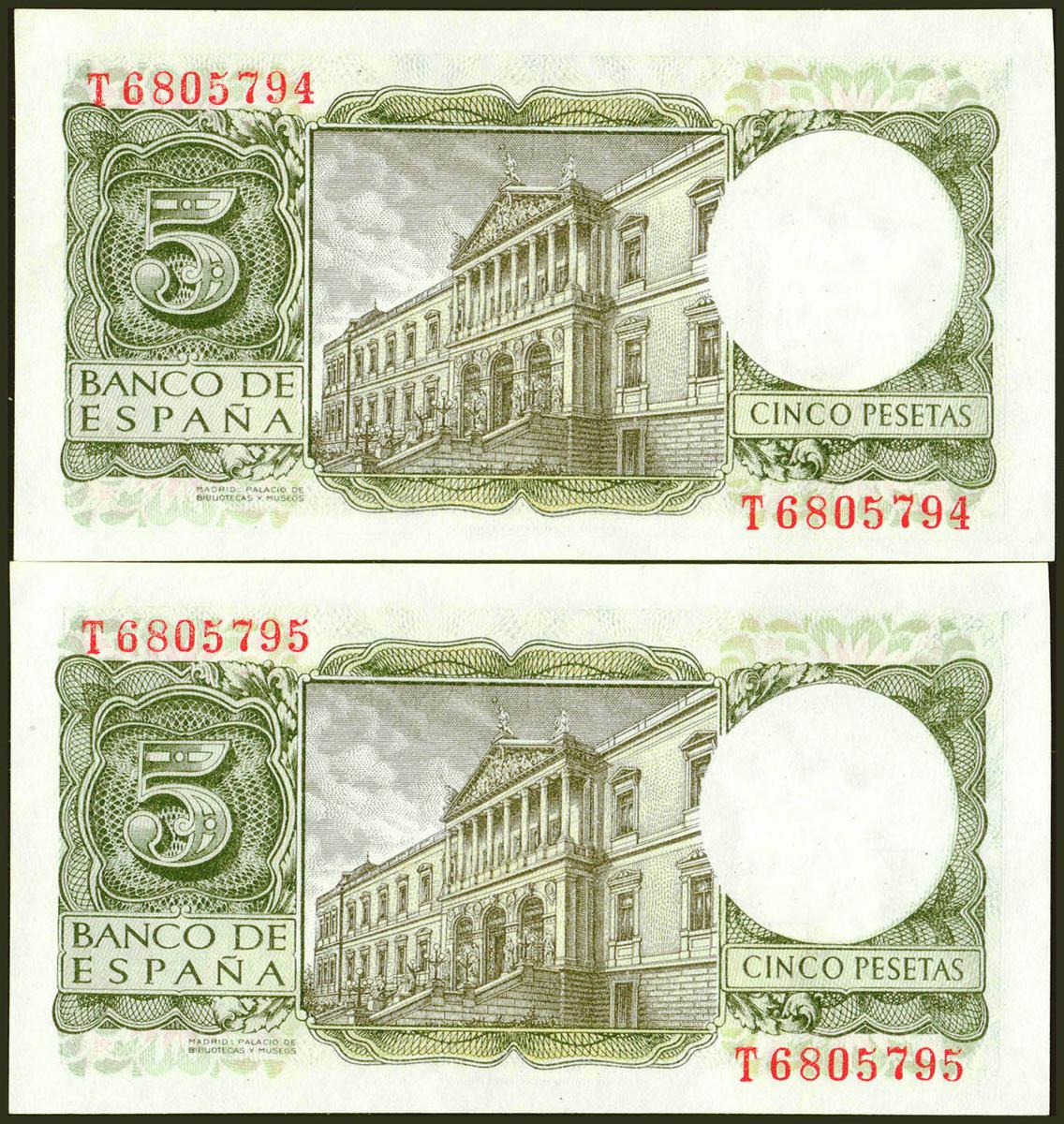 5 Pesetas. 22 de Julio de 1954. Pareja correlativa. Serie T. (Edifil 2021: 466a). Conserva todo su apresto original. SC--.
