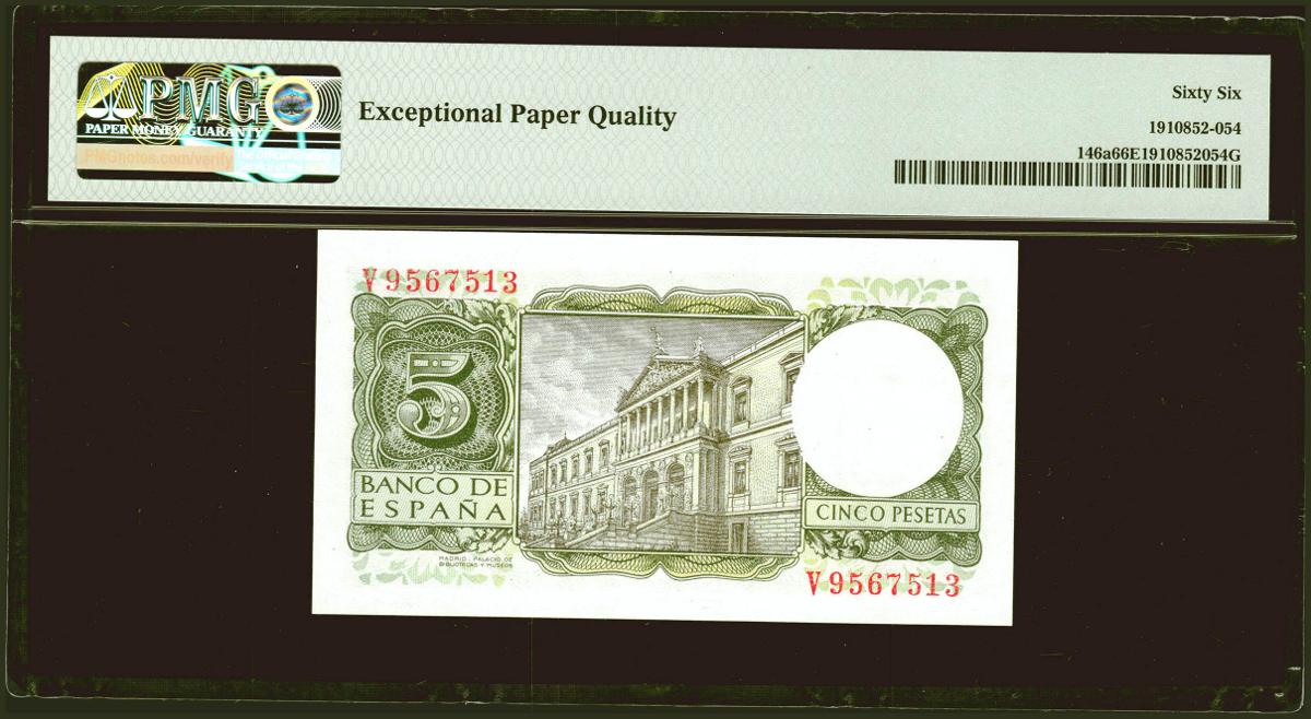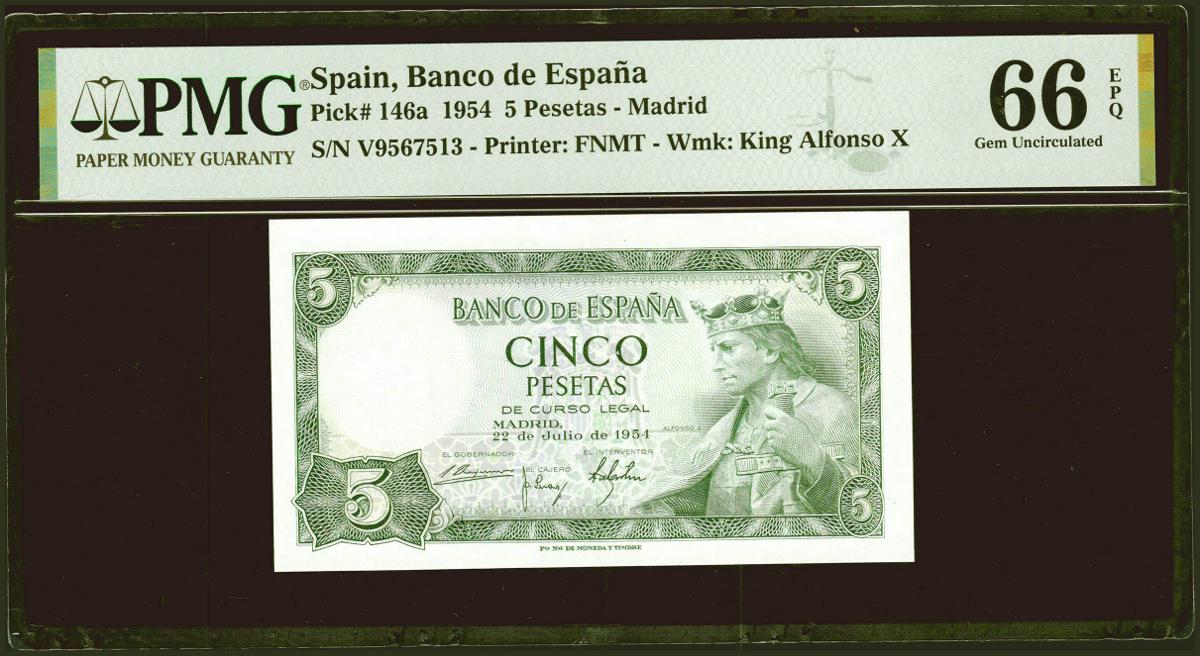 5 Pesetas. 22 de Julio de 1954. Serie V. (Edifil 2021: 466a, Pick: 146a). Inusual en esta excepcional calidad, apresto original. SC. Encpasulado PMG66EPQ.