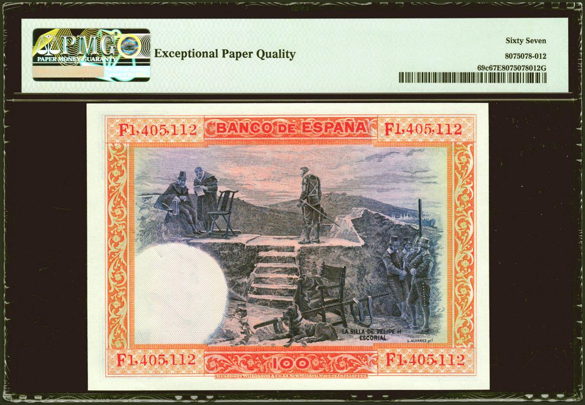 100 Pesetas. 1 de Junio de 1925. Serie F. (Edifil 2021: 350, Pick: 69c). Raro en esta excepcional calidad, apresto original SC. Encapsulado PMG67EPQ.
