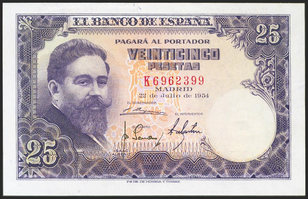 25 Pesetas. 22 de Julio de 1954. Serie K. (Edifil 2021: 467a). Conserva todo su apresto original. EBC+.