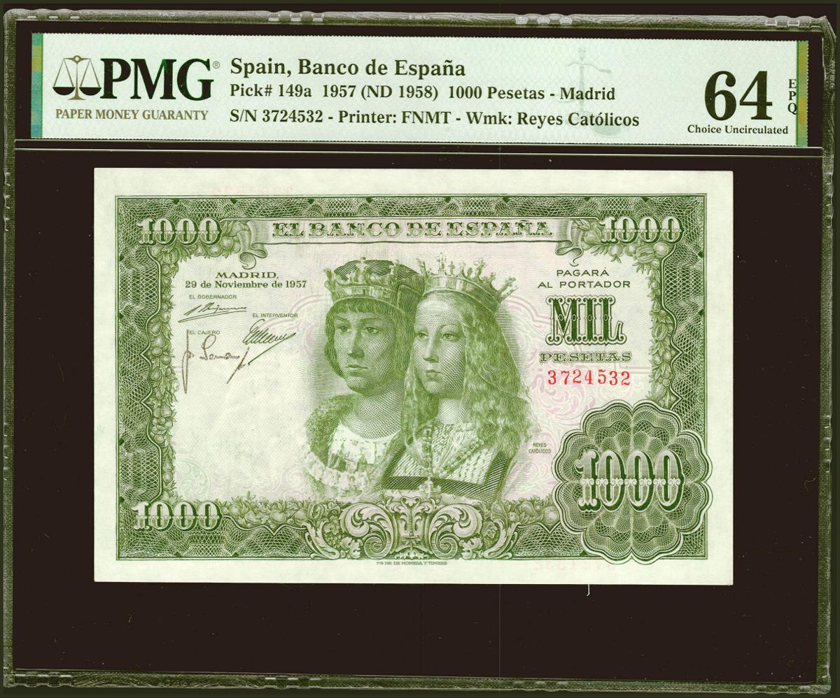 1000 Pesetas. 29 de Noviembre de 1957. Sin serie. (Edifil 2021: 469, Pick: 149a). Muy raro en esta excepcional calidad, apresto original. SC. Encapsulado PMG64EPQ.