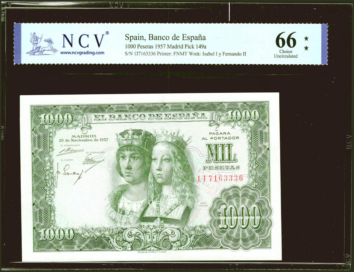 1000 Pesetas. 29 de Noviembre de 1957. Serie 1I. (Edifil 2021: 469b, Pick: 149a). Muy raro en esta excepcional calidad. SC. Encapsulado NCV66.