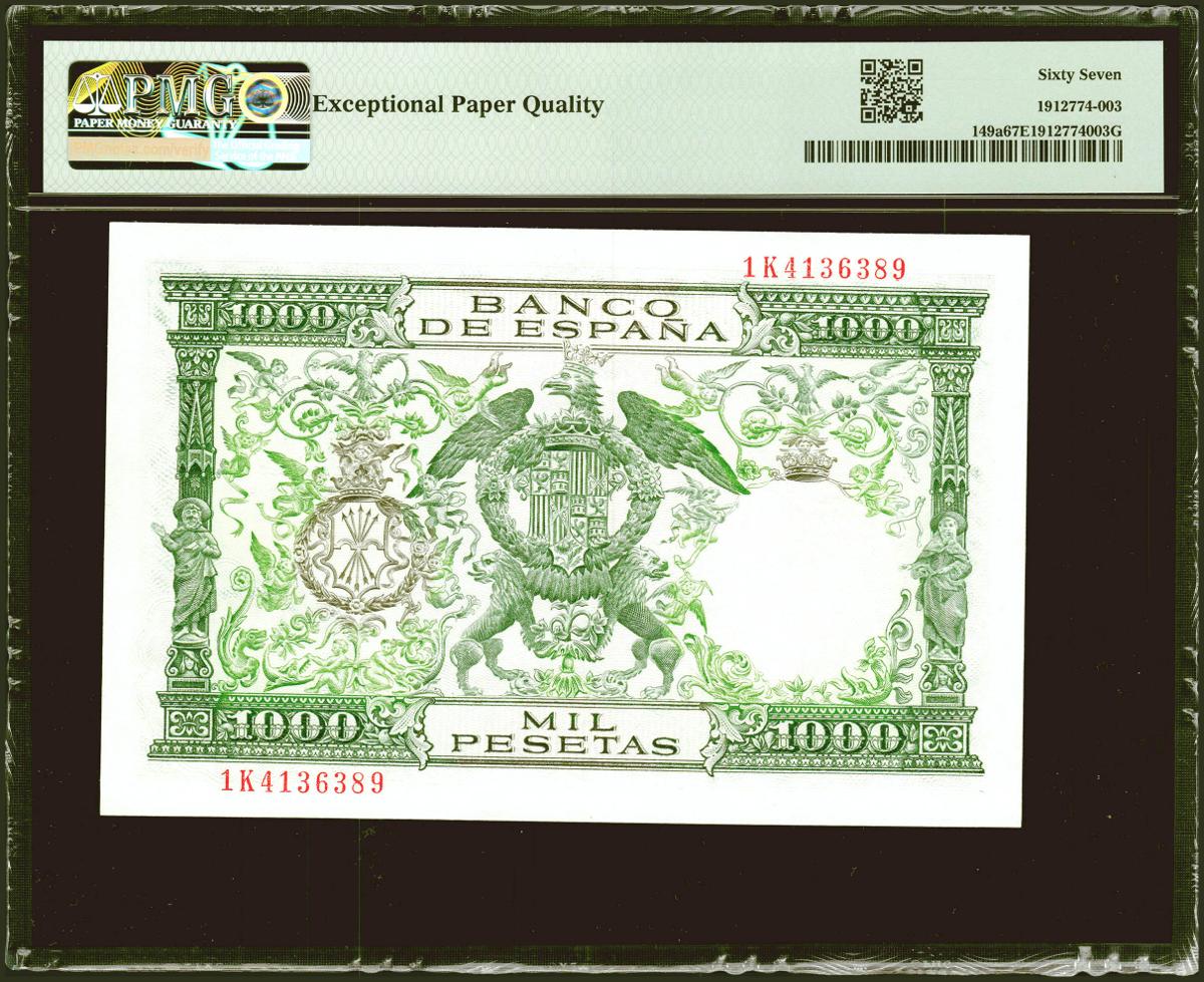 1000 Pesetas. 29 de Noviembre de 1957. Serie 1K. (Edifil 2021: 469b, Pick: 149a). Muy raro en esta excepcional calidad, apresto original. SC. Encapsulado PMG67EPQ.