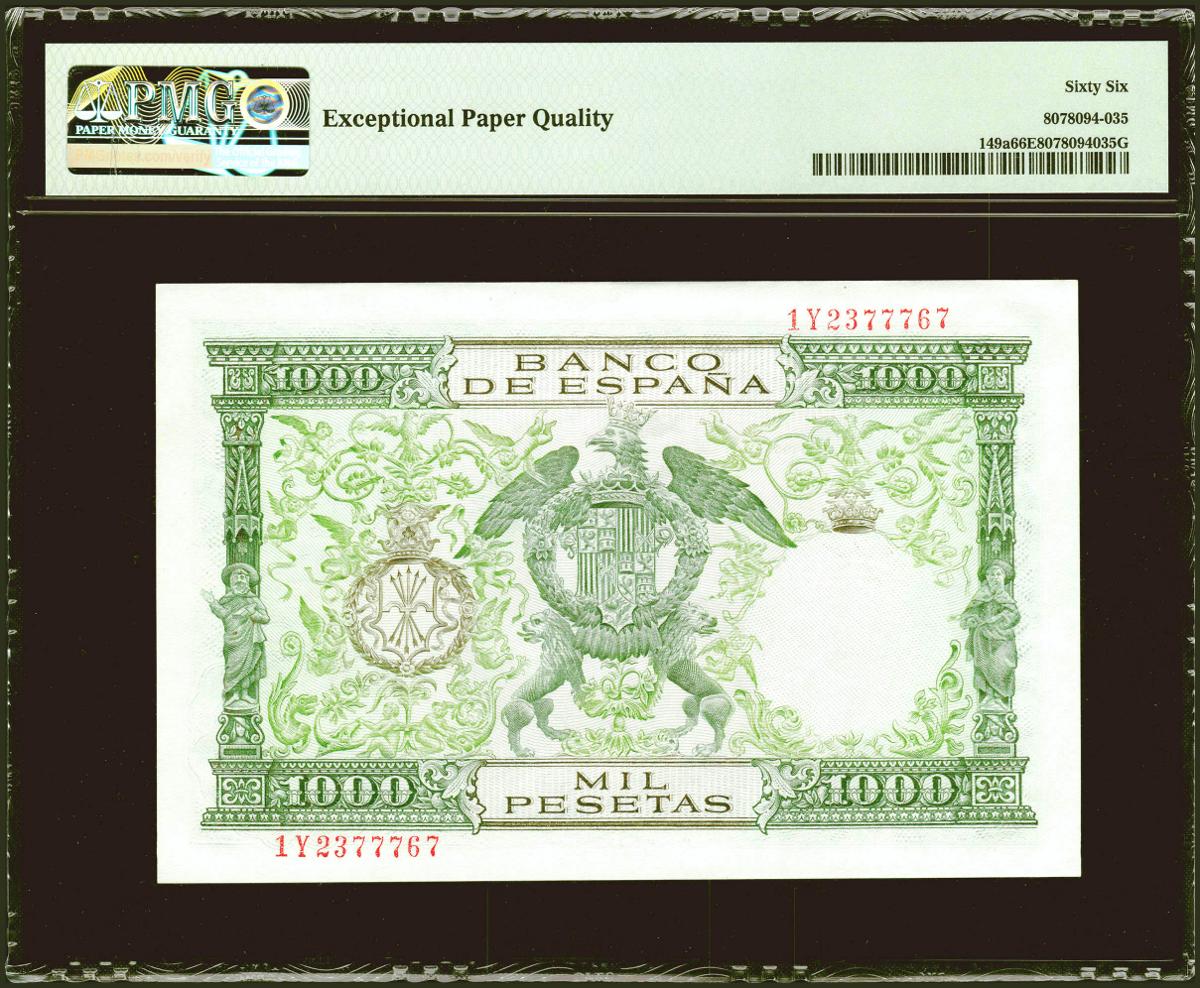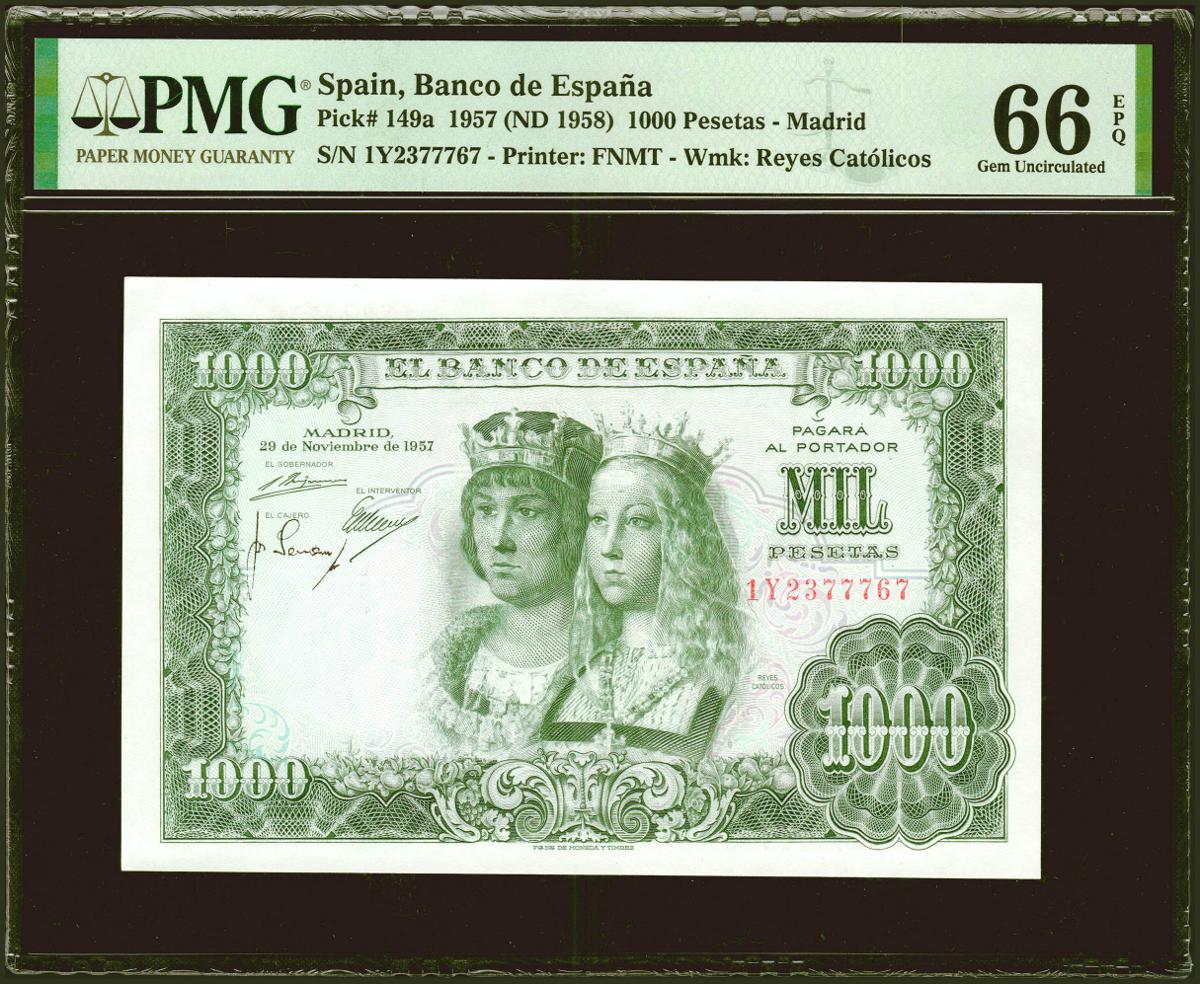1000 Pesetas. 29 de Noviembre de 1957. Serie 1Y, última serie emitida. (Edifil 2021: 469b, Pick: 149a). Raro en esta excepcional calidad, apresto original. SC. Encapsulado PMG66EPQ.