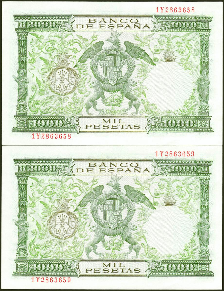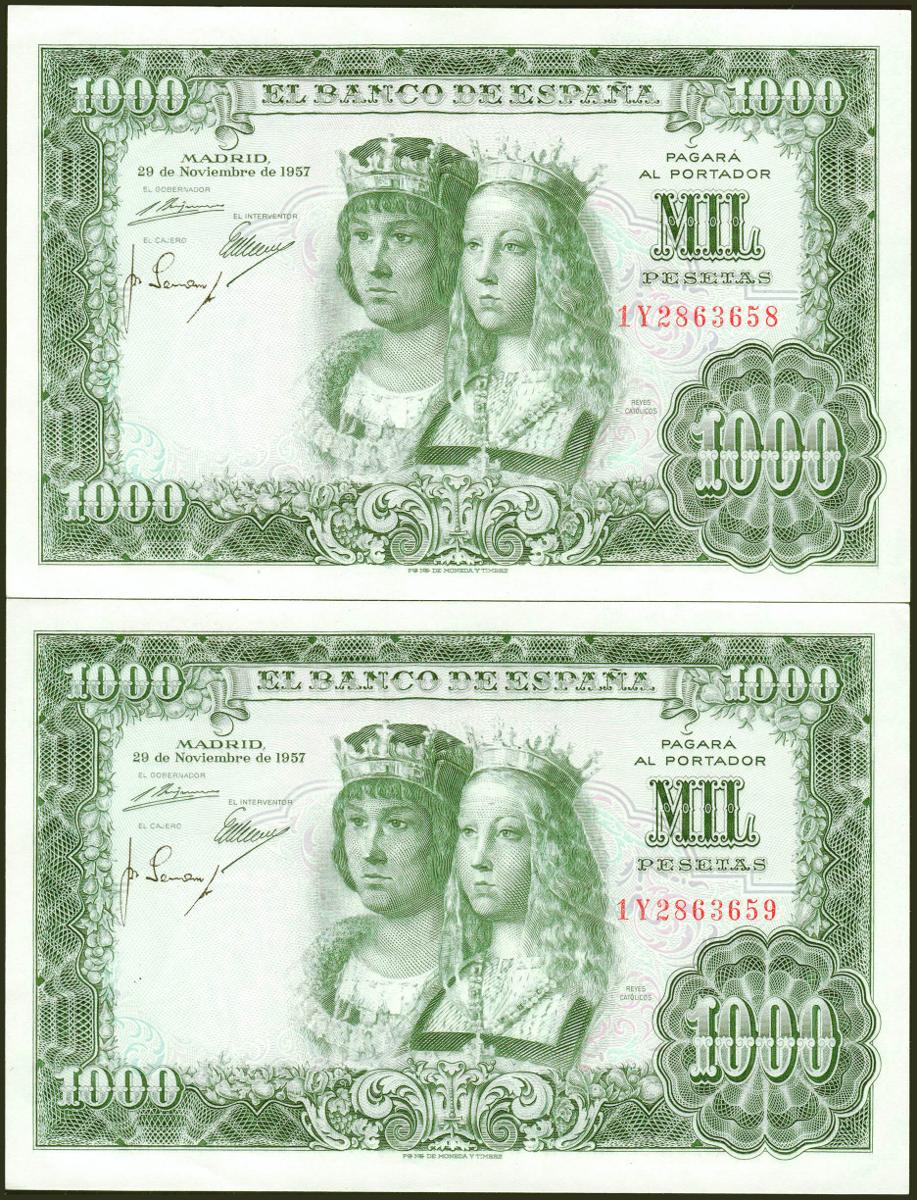 1000 Pesetas. 29 de Noviembre de 1957. Pareja correlativa. Serie 1Y, última serie emitida. (Edifil 2021: 469b). Conserva todo su apresto original. SC-.