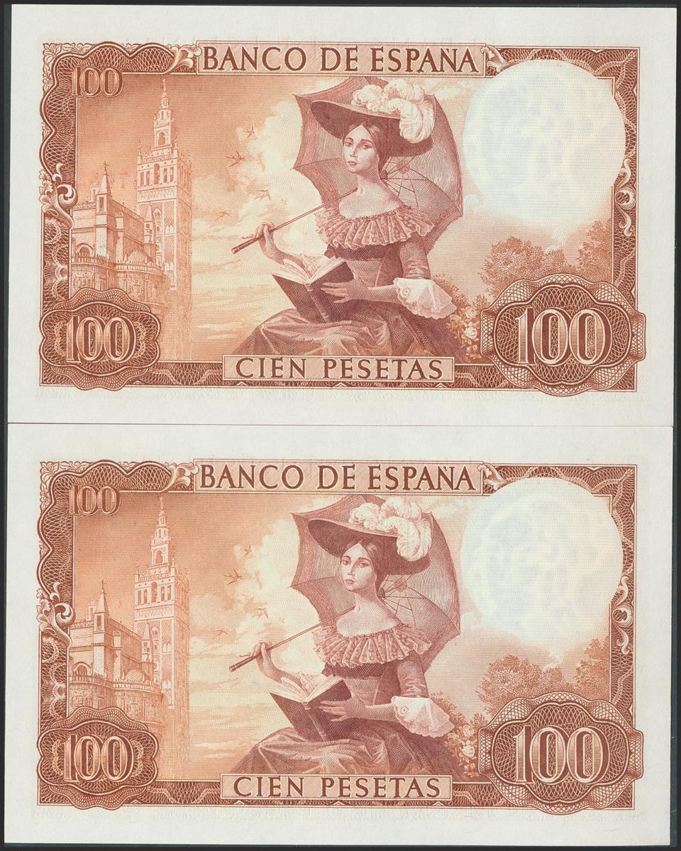 100 Pesetas. 19 de Noviembre de 1965. Pareja correlativa. Sin serie. (Edifil 2017: 470). Apresto original. SC.