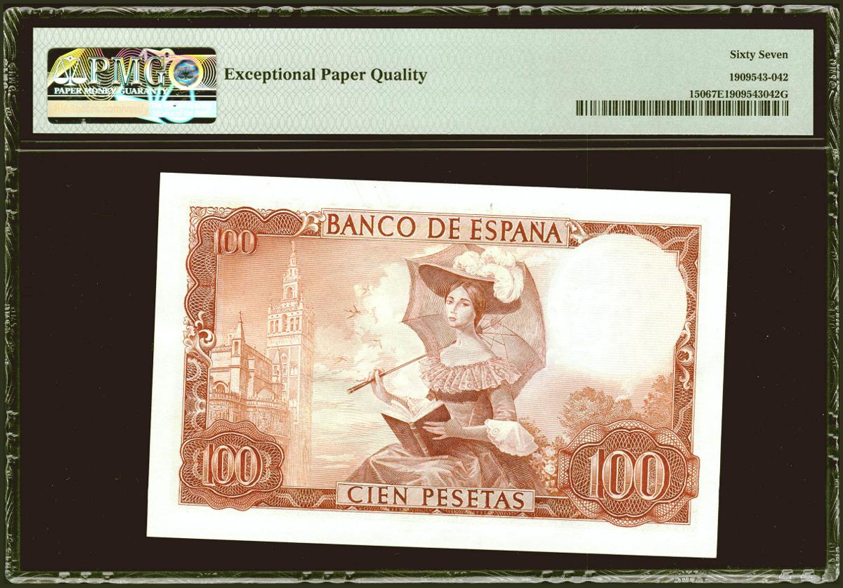 100 Pesetas. 19 de Noviembre de 1965. Serie A. (Edifil 2021: 470a, Pick: 150). Raro en esta excepcional calidad, apresto original. Encapsulado PMG67EPQ.