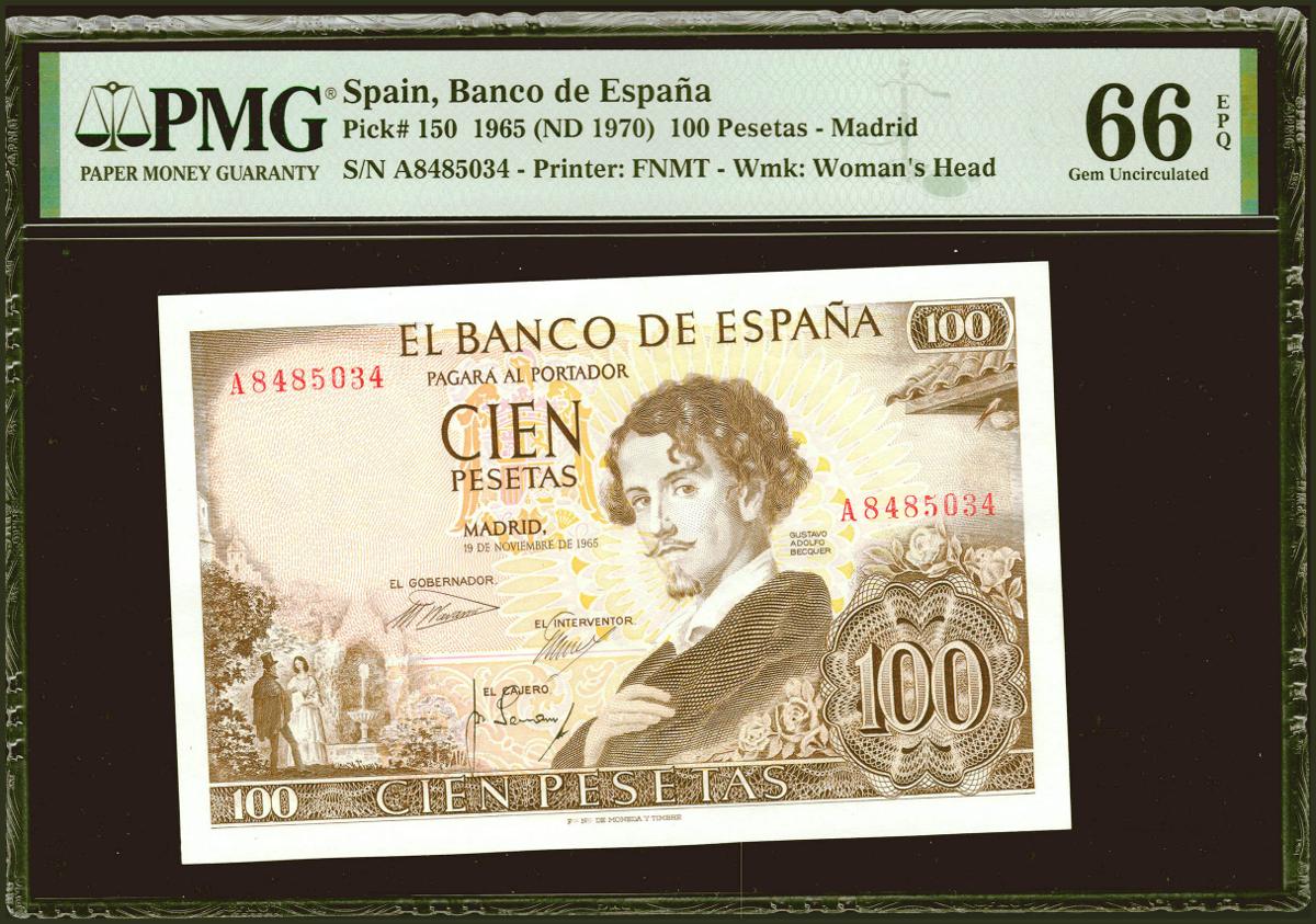 100 Pesetas. 19 de Noviembre de 1965. Serie A. (Edifil 2021: 470a, Pick: 150). Raro en esta excepcional calidad, apresto original. Encapsulado PMG66EPQ.