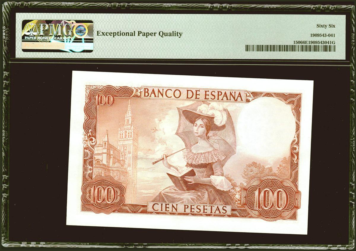 100 Pesetas. 19 de Noviembre de 1965. Serie A. (Edifil 2021: 470a, Pick: 150). Raro en esta excepcional calidad, apresto original. Encapsulado PMG66EPQ.