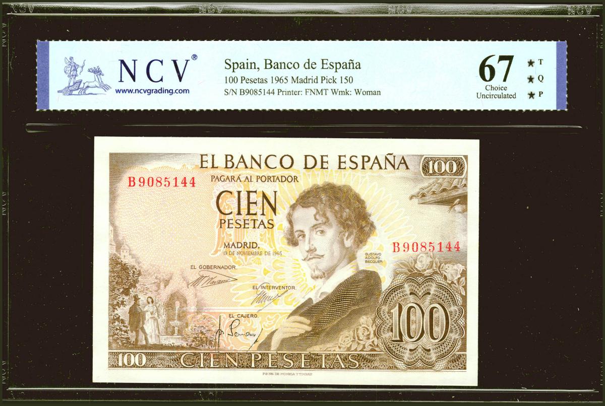 100 Pesetas. 19 de Noviembre de 1965. Serie B. (Edifil 2021: 470a, Pick: 150). Raro en esta excepcional calidad, apresto original. Encapsulado NCV67TQP.