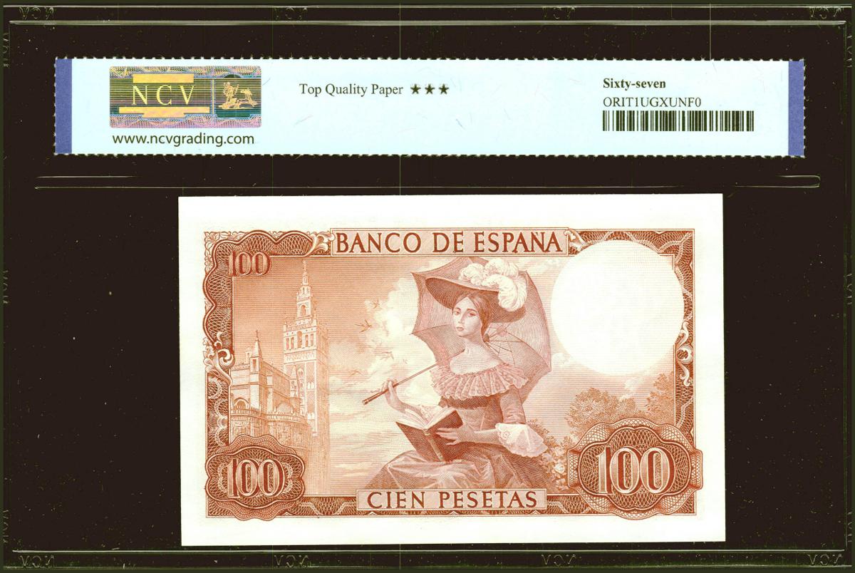 100 Pesetas. 19 de Noviembre de 1965. Serie B. (Edifil 2021: 470a, Pick: 150). Raro en esta excepcional calidad, apresto original. Encapsulado NCV67TQP.