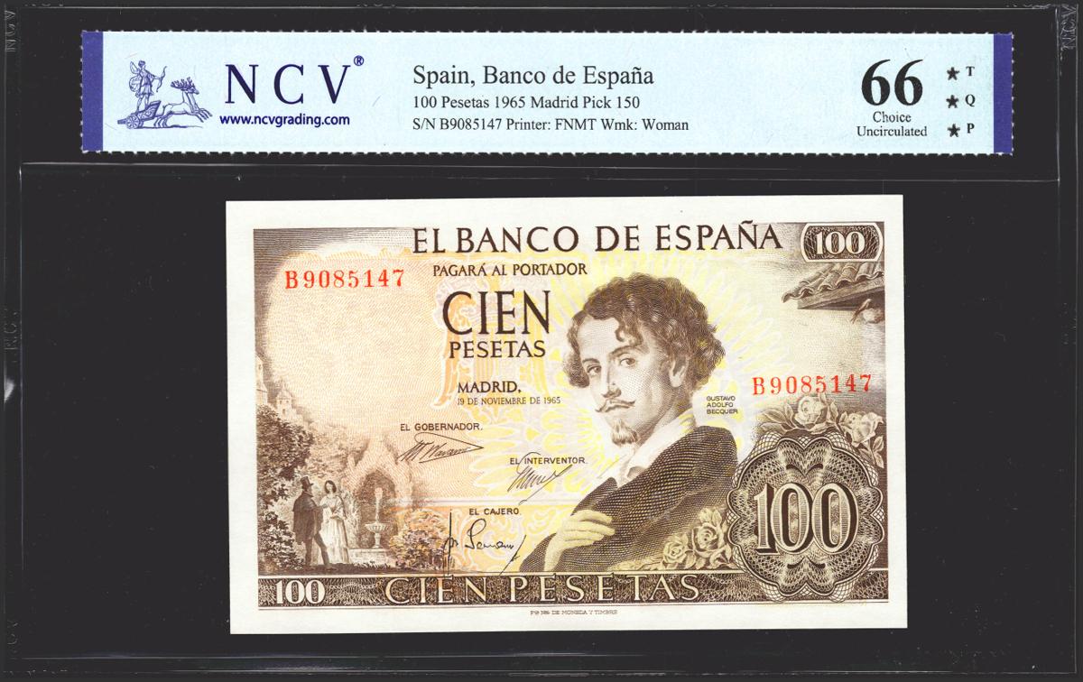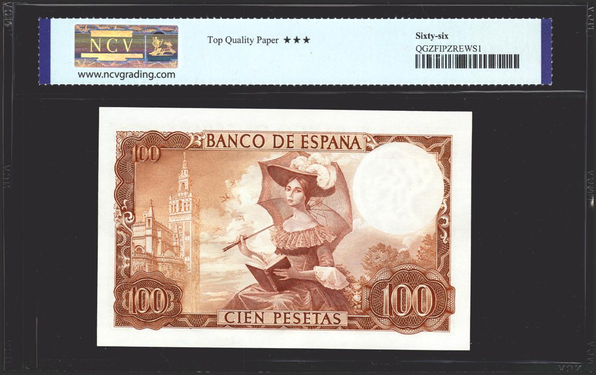 100 Pesetas. 19 de Noviembre de 1965. Serie B. (Edifil 2021: 470a, Pick: 150). Raro en esta excepcional calidad, apresto original. Encapsulado NCV66TQP.