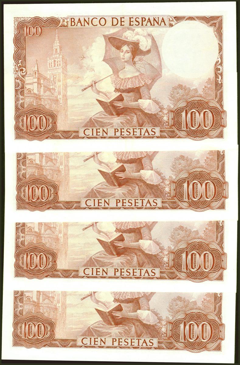 Conjunto de 4 billetes correlativos de 100 Pesetas, emitidos el 19 de Noviembre de 1965, todos ellos con la serie E (Edifil 2021: 470a), conservando su apresto original. SC/EBC+.