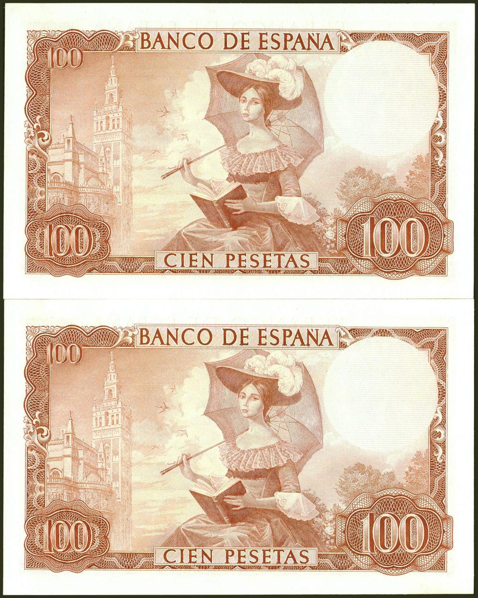 100 Pesetas. 19 de Noviembre de 1965. Pareja correlativa. Serie E. (Edifil 2021: 470a). Conserva todo su apresto original. SC.