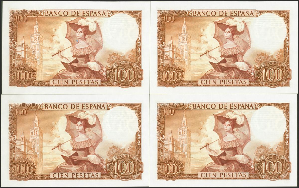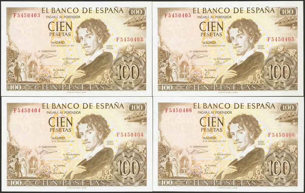 Conjunto de 4 billetes correlativos de 100 Pesetas, emitidos el 19 de Noviembre de 1965, todos ellos con la serie F (Edifil 2021: 470a), conservando su apresto original. SC-.