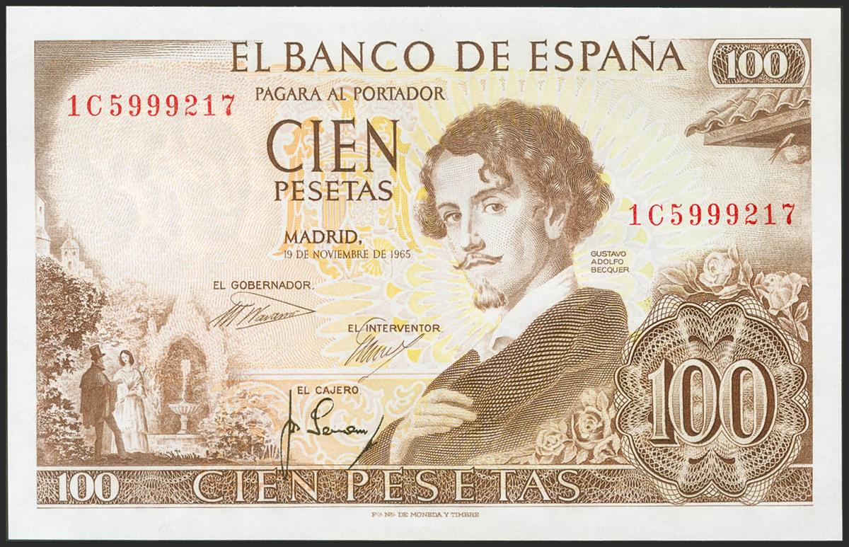 100 Pesetas. 19 de Noviembre de 1965. Serie 1C. (Edifil 2021: 470a). Conserva todo su apresto original. SC.