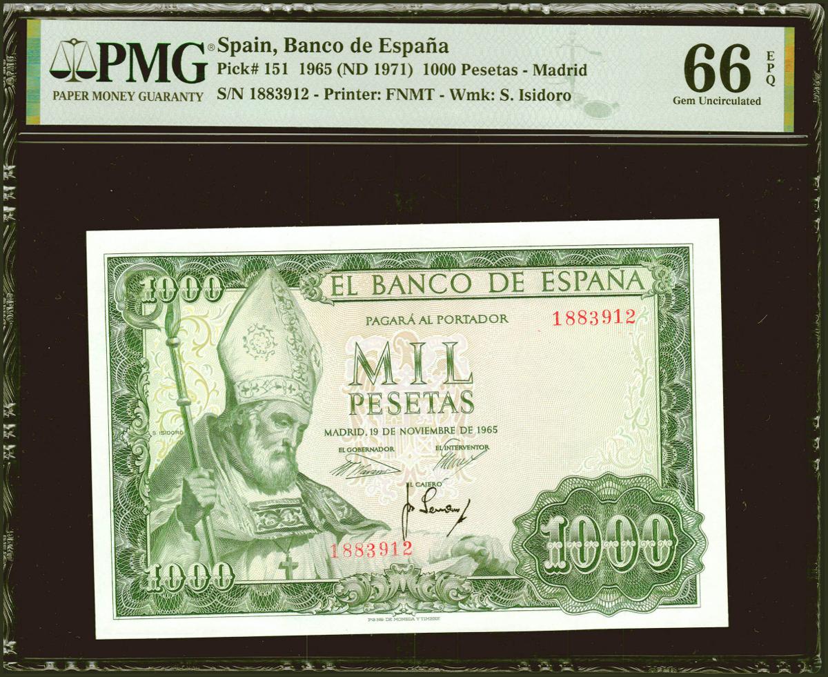 1000 Pesetas. 19 de Noviembre de 1965. Sin serie. (Edifil 2021: 471, Pick: 151). Raro en esta excepcional calidad, apresto original. SC. Encapsulado PMG66EPQ.