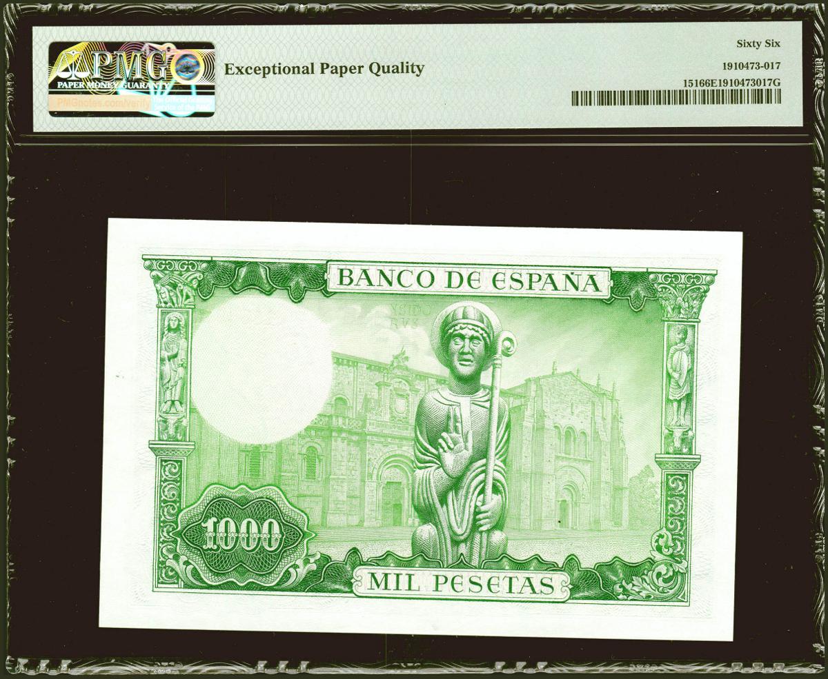 1000 Pesetas. 19 de Noviembre de 1965. Sin serie. (Edifil 2021: 471, Pick: 151). Raro en esta excepcional calidad, apresto original. SC. Encapsulado PMG66EPQ.