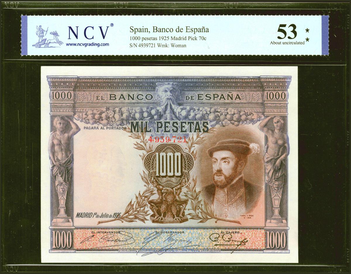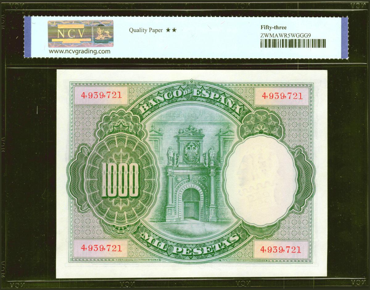 1000 Pesetas. 1 de Julio de 1925. Sin serie y numeración posterior al 3646000. (Edifil 2021: 351, Pick: 70c). Inusual en esta calidad. EBC. Encapsulado NCV53.