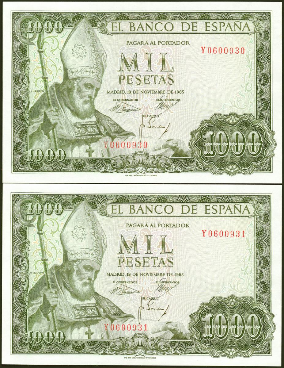 1000 Pesetas. 19 de Noviembre de 1965. Pareja correlativa. Serie Y. (Edifil 2021: 471b). Conserva todo su apresto original. SC.