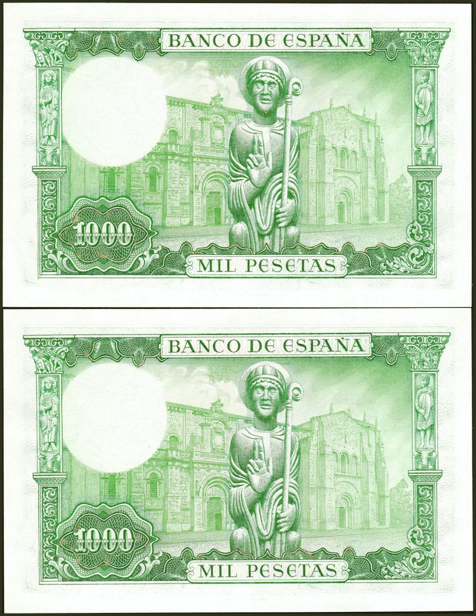 1000 Pesetas. 19 de Noviembre de 1965. Pareja correlativa. Serie Y. (Edifil 2021: 471b). Conserva todo su apresto original. SC.