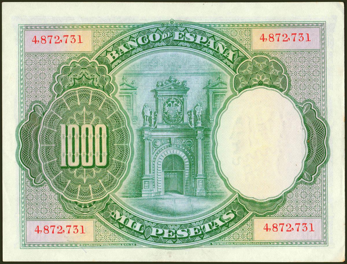 1000 Pesetas. 1 de Julio de 1925. Sin serie y numeración posterior a 3646000. (Edifil 2021: 351). Conserva gran parte del apresto original. EBC.