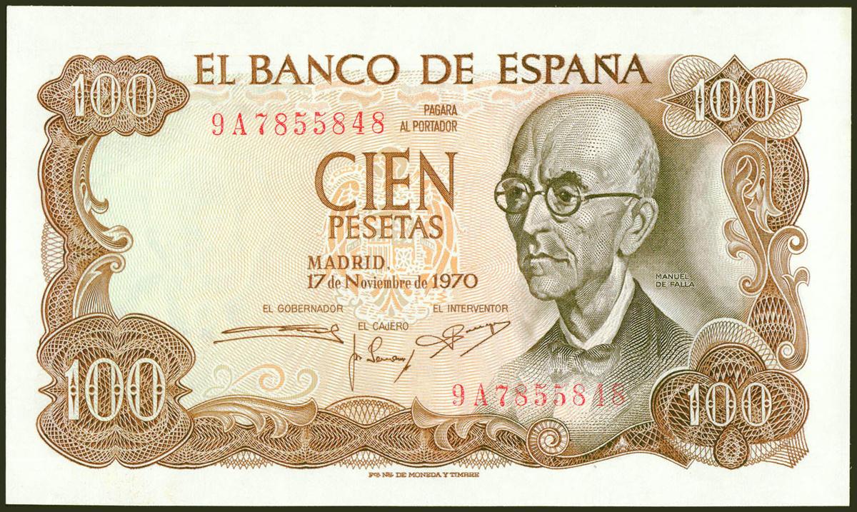 100 Pesetas. 17 de Noviembre de 1970. Serie especial 9A. (Edifil 2021: 472d). Apresto original. SC.