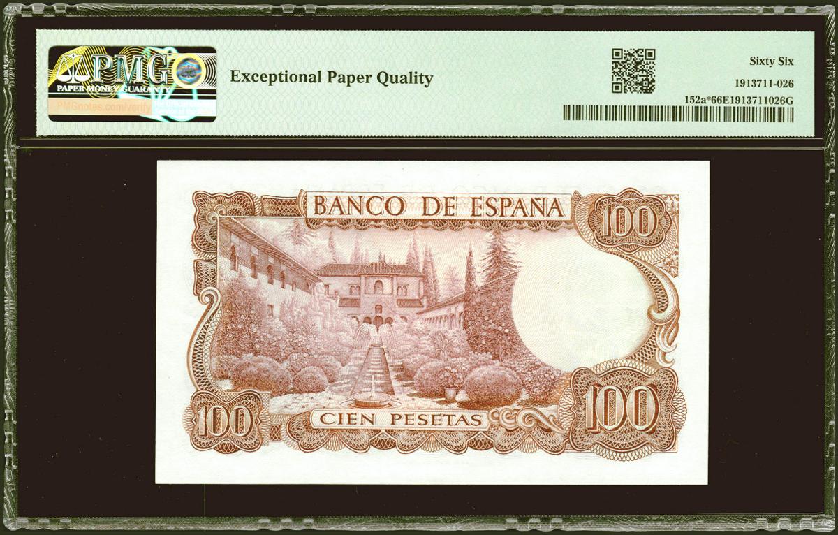 100 Pesetas. 17 de Noviembre de 1970. Serie especial 9B. (Edifil 2021: 472d, Pick: 152a*). Apresto original. SC. Encapsulado PMG66EPQ.