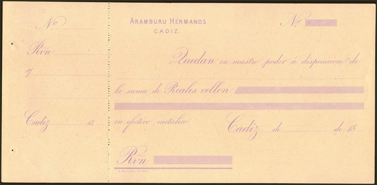 (18__ca). Aramburu Hermanos, Cádiz (Recibo). Para entender mejor la contextualización de este Banco recomendamos la obra "Obligaciones, vales y documentos puestos en circulación como papel moneda en España", de Don Ramón Cobo Huici. SC--.