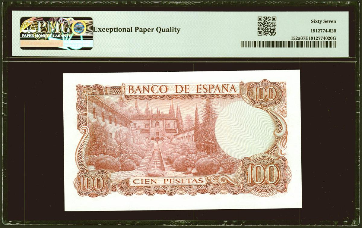 100 Pesetas. 17 de Noviembre de 1970. Sin serie y numeración muy baja. (Edifil 2021: 472, Pick: 152a). Raro en esta excepcional calidad, apresto original. SC. Encapsulado PMG67EPQ.