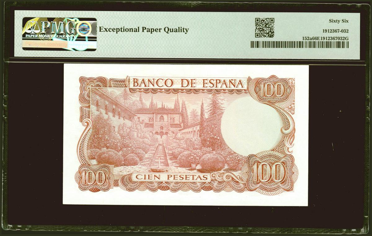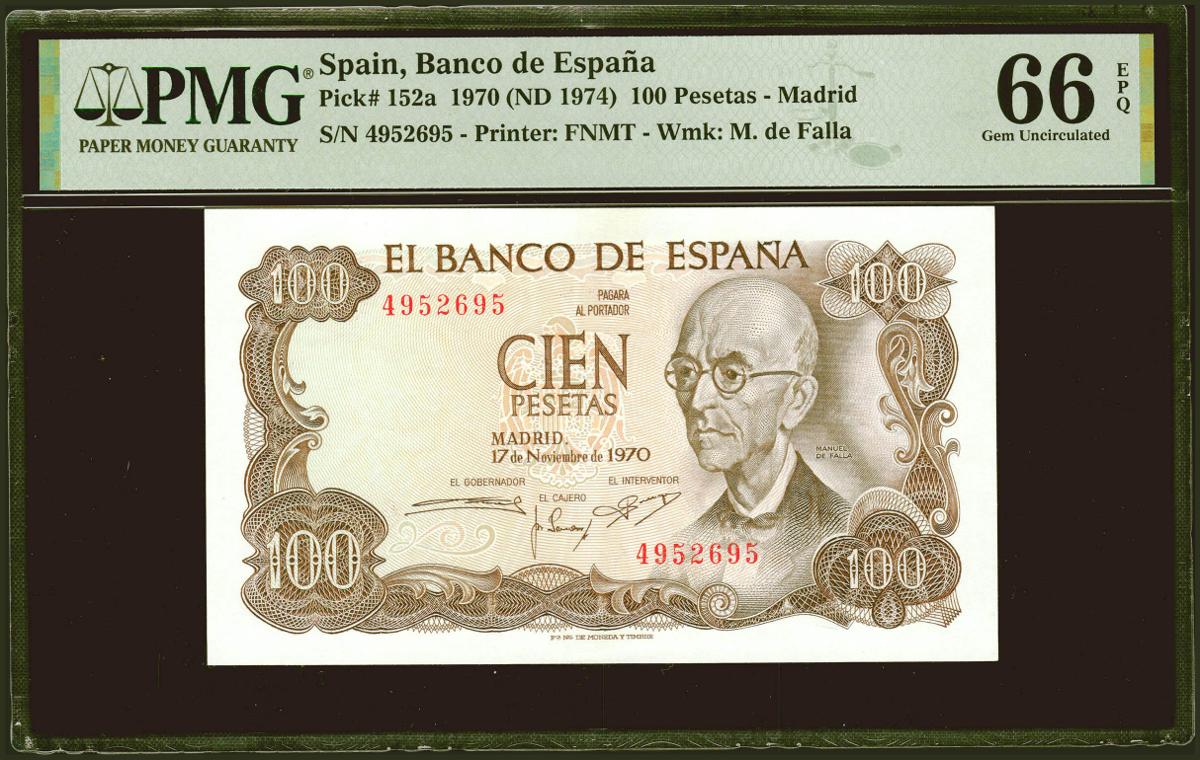 100 Pesetas. 17 de Noviembre de 1970. Sin serie. (Edifil 2021: 472, Pick: 152a). Apresto original. SC. Encapsulado PMG66EPQ.