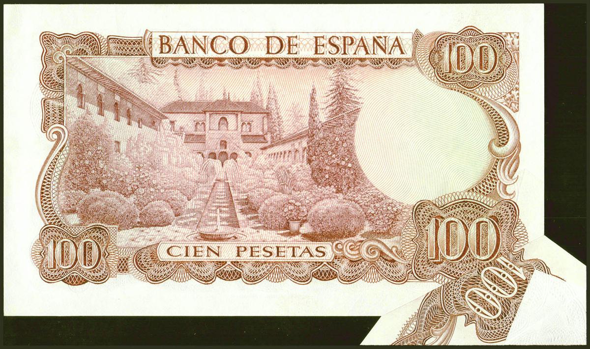 100 Pesetas. 17 de Noviembre de 1970. Error de guillotinado en la esquina inferior izquierda. Serie 5N. (Edifil 2021: 472c). Inusual y espectacular. SC-.