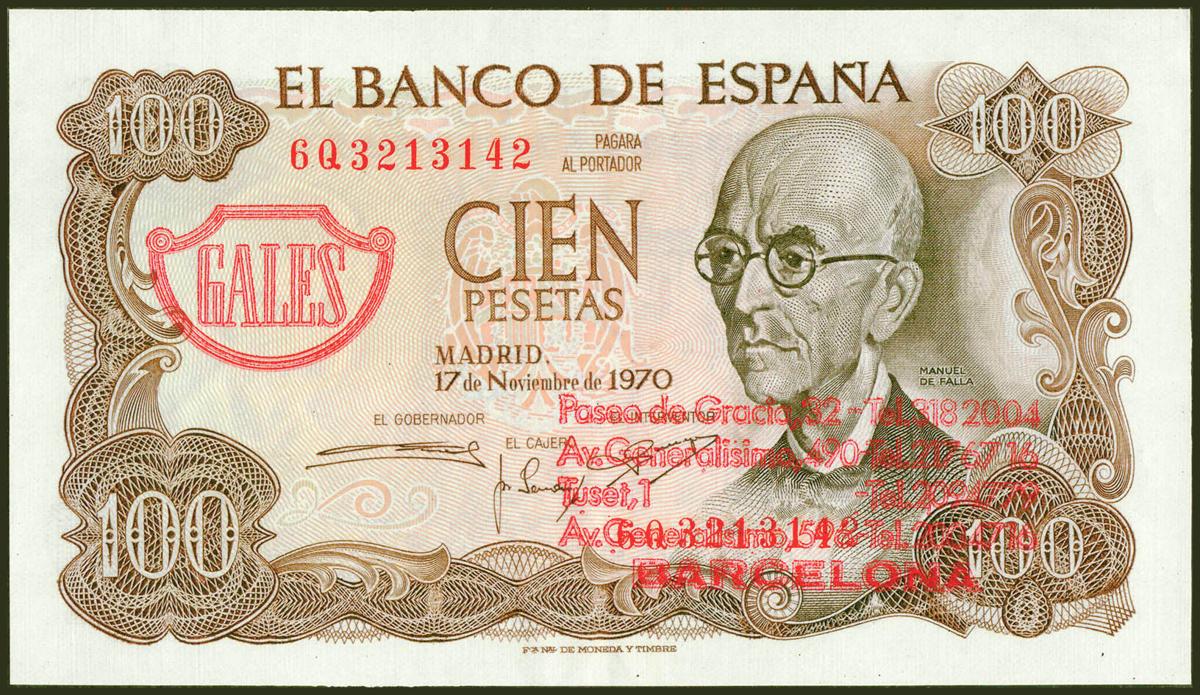 100 Pesetas. 17 de Noviembre de 1970. Serie 6Q y con publicidad de sastrería Gales y Garly, el billete se presenta dentro de una bolsita de celofán. (Edifil 2021: 472c). Conserva parte de su apresto original. EBC+.