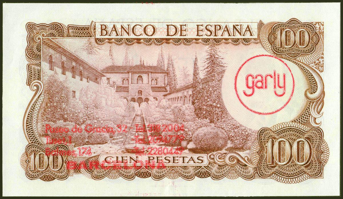 100 Pesetas. 17 de Noviembre de 1970. Serie 6Q y con publicidad de sastrería Gales y Garly, el billete se presenta dentro de una bolsita de celofán. (Edifil 2021: 472c). Conserva parte de su apresto original. EBC+.