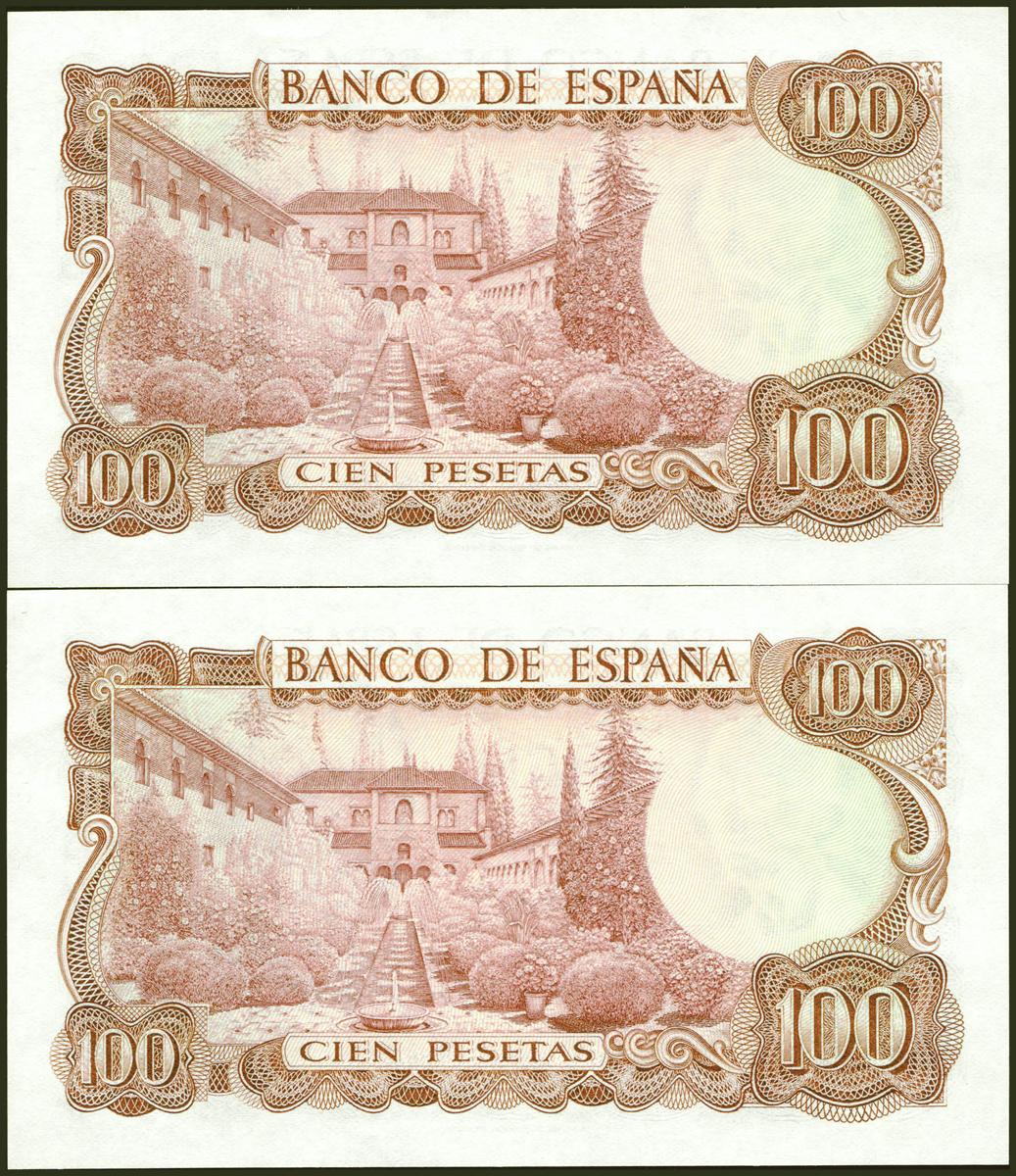 100 Pesetas. 17 de Noviembre de 1970. Pareja correlativa. Serie 7F. (Edifil 2021: 472c). Conserva todo el apresto original. SC-.