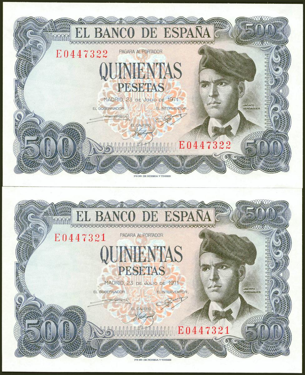 500 Pesetas. 23 de Julio de 1971. Pareja correlativa. Serie E. (Edifil 2021: 473a). Conserva todo su apresto original. SC-.