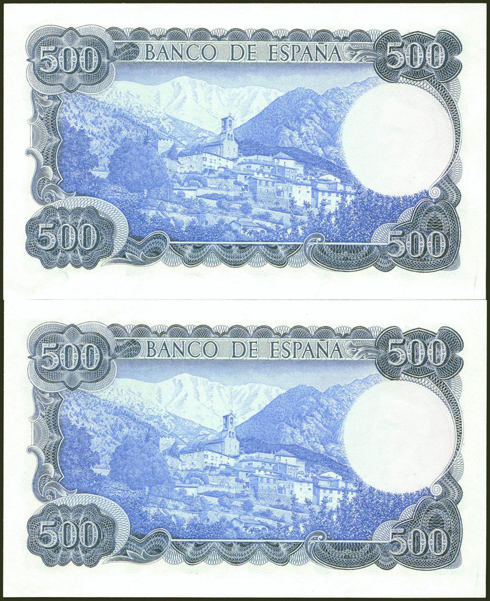 500 Pesetas. 23 de Julio de 1971. Pareja correlativa. Serie E. (Edifil 2021: 473a). Conserva todo su apresto original. SC-.