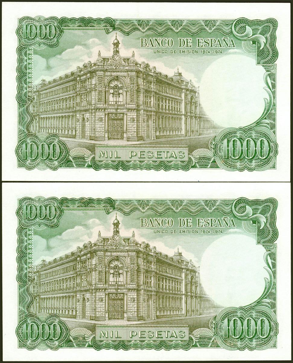 1000 Pesetas. 17 de Septiembre de 1971. Pareja correlativa. Sin serie. (Edifil 2021: 474). Conserva parte del apresto original. EBC.
