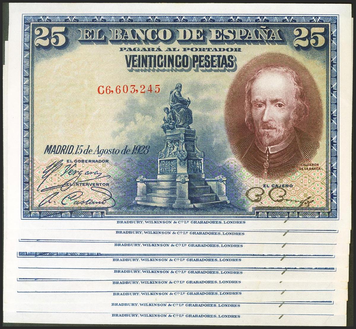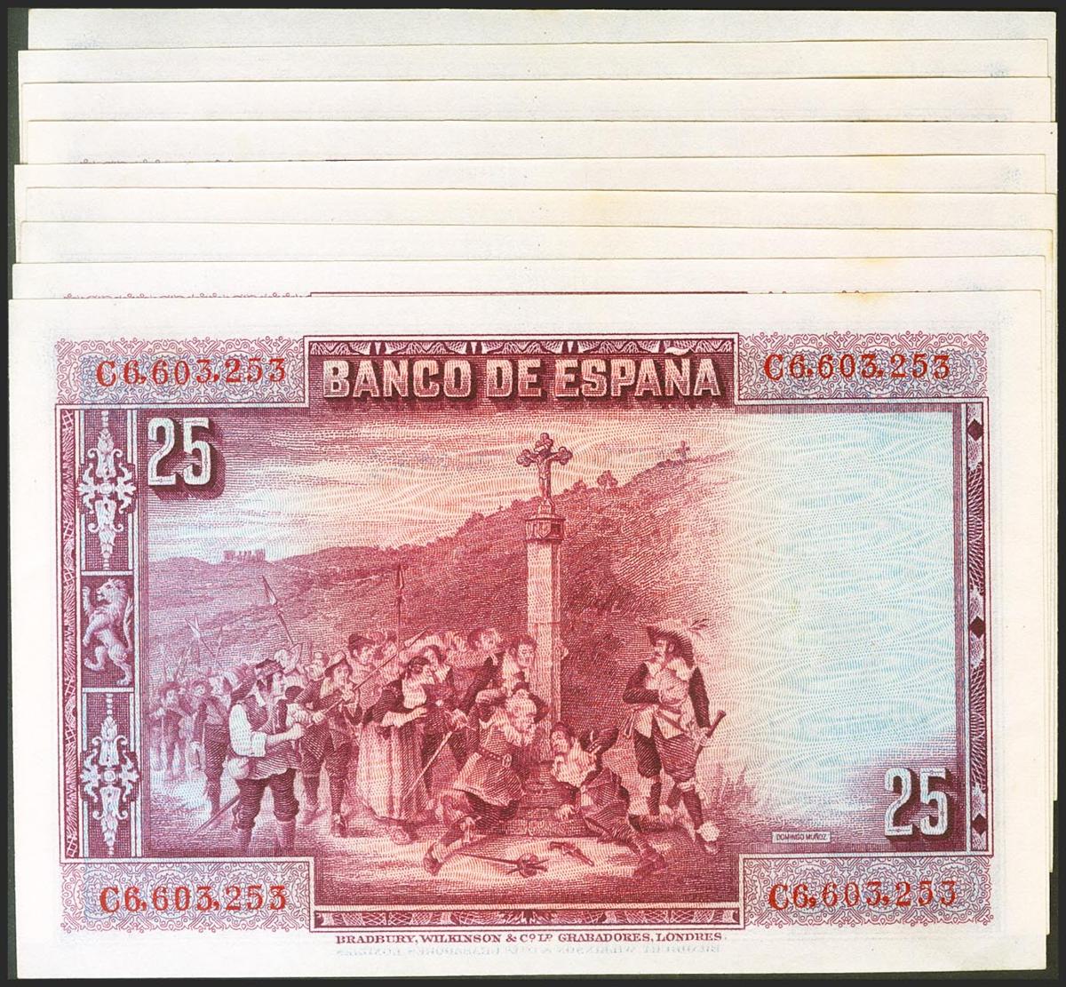 Precioso conjunto de 9 billetes correlativos de 25 Pesetas emitidos el 15 de Agosto de 1928 con la serie C (Edifil 2021: 353), conservando todo su apresto original. SC/SC-.