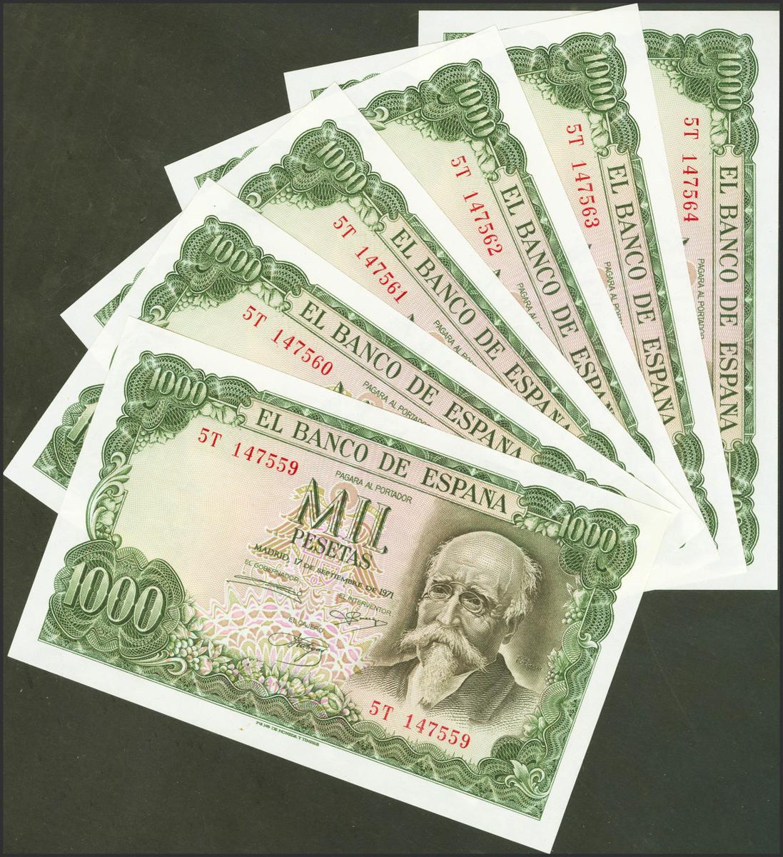 Conjunto de 6 billetes correlativos de 1000 Pesetas emitidos el 17 de Septiembre de 1971, todos ellos con la serie 5T (Edifil 2021: 474c), conservando su apresto original. SC-.