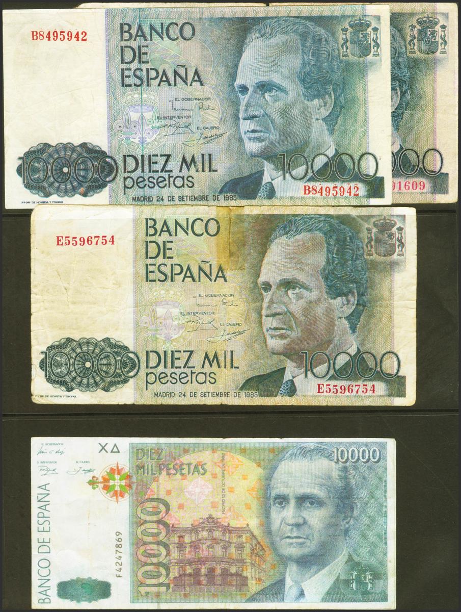 Precioso conjunto de 7 billetes falsos de época del periodo de Juan Carlos I. (Edifil: 474F, 475F, 477F, 481F, 485F). RC.