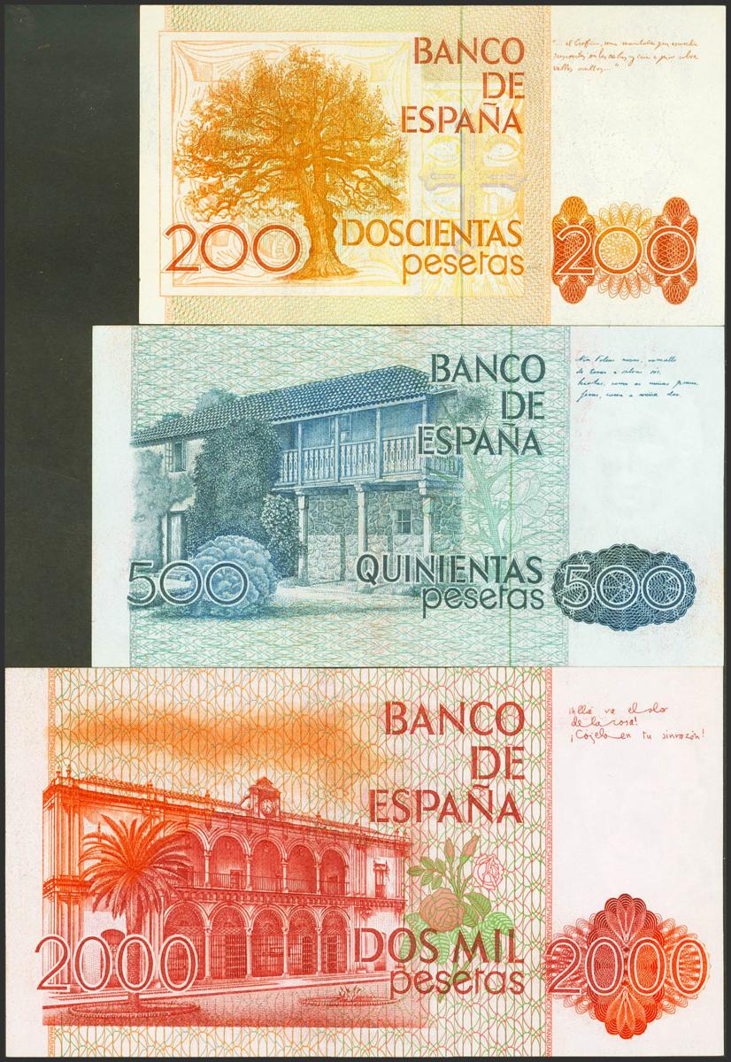 Conjunto de 200 Pesetas, 500 Pesetas y 2000 Pesetas, emitidos el 16 de Septiembre de 1980, 23 de Octubre de 1979 y 22 de Julio de 1980, respetivamente, sin series y con la misma bajísima numeración (0000362) (Edifil 2021: 476, 479, 480). EBC+.