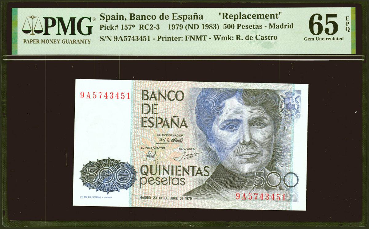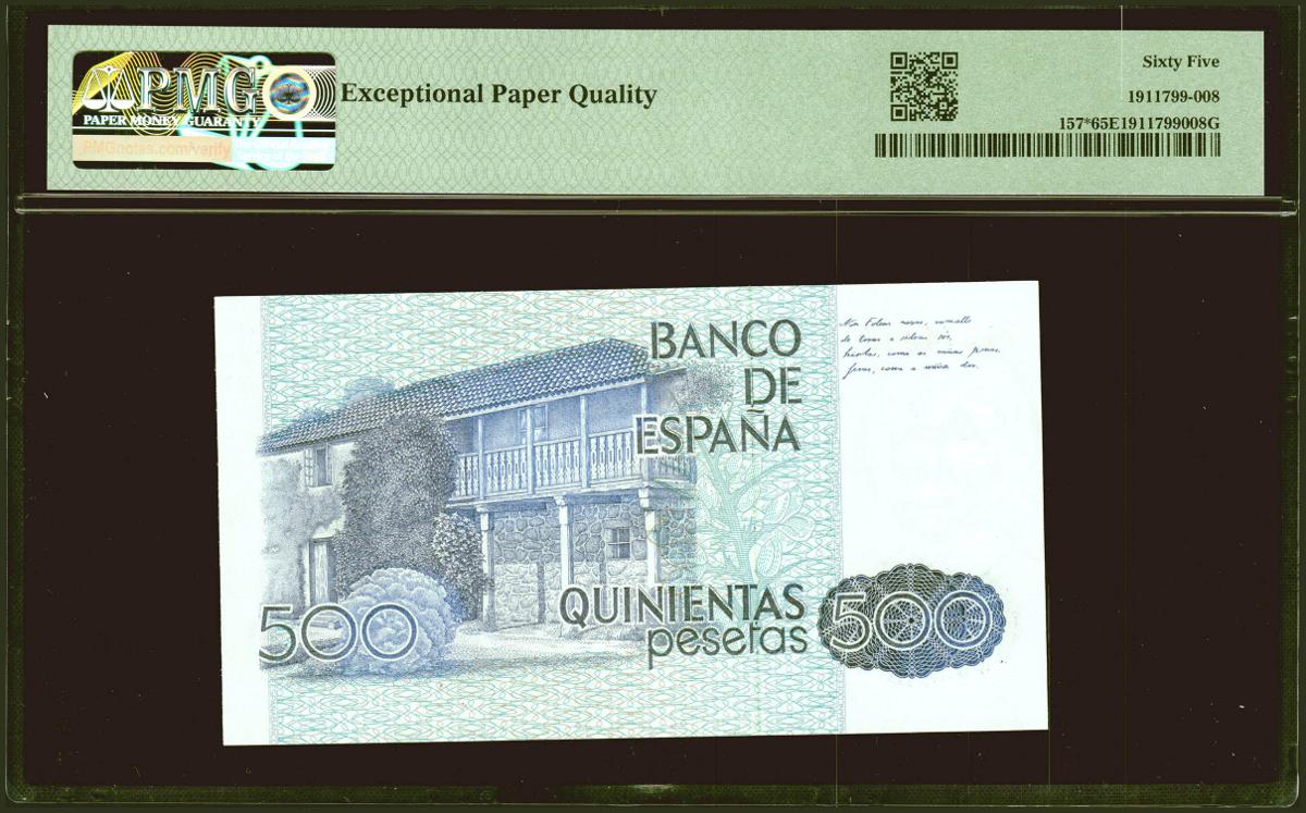 500 Pesetas. 23 de Octubre de 1979. Serie especial 9A. (Edifil 2021: 476b, Pick: 157*). Inusual en esta excepcional calidad, apresto original. SC. Encapsulado PMG65EPQ.