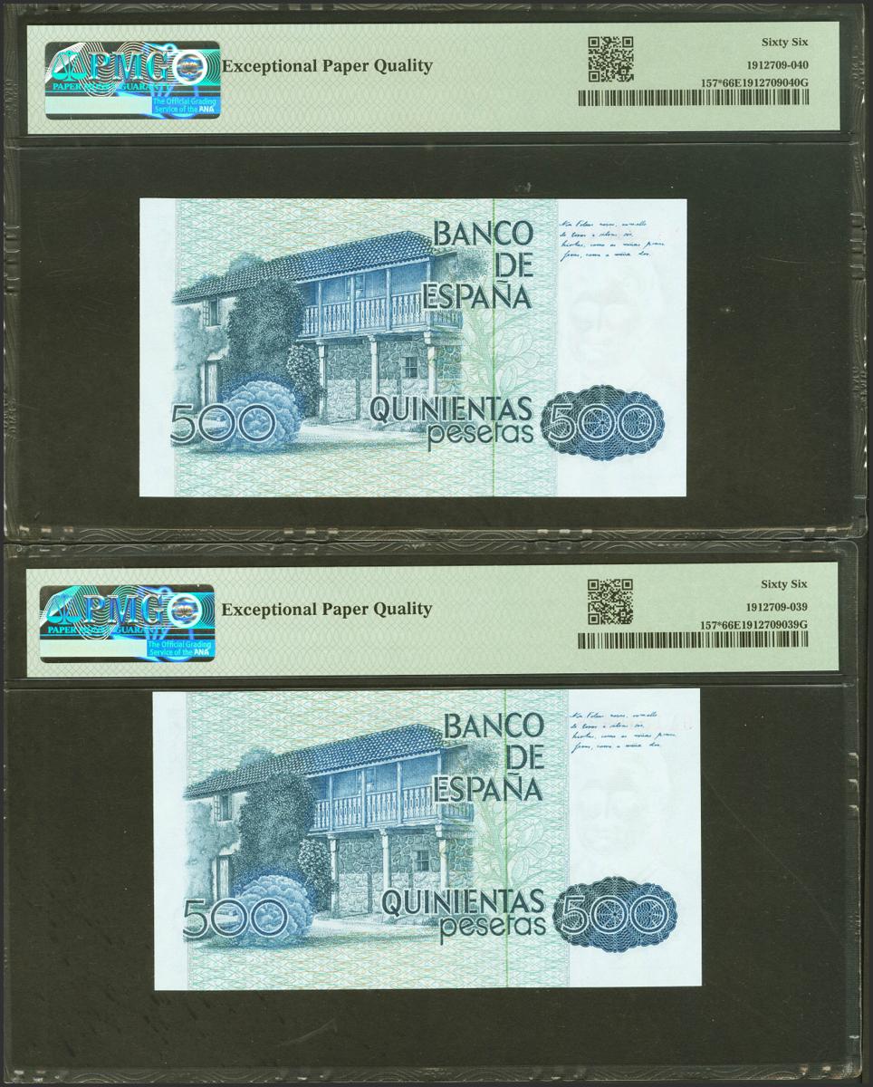 500 Pesetas. 23 de Octubre de 1979. Pareja correlativa. Serie especial 9A. (Edifil 2021: 476b, Pick: 157*). Inusual en esta excepcional calidad. SC. Encapsulado PMG66EPQ, ambos.