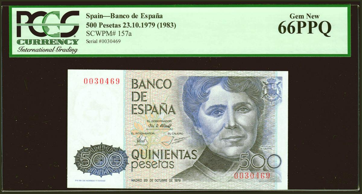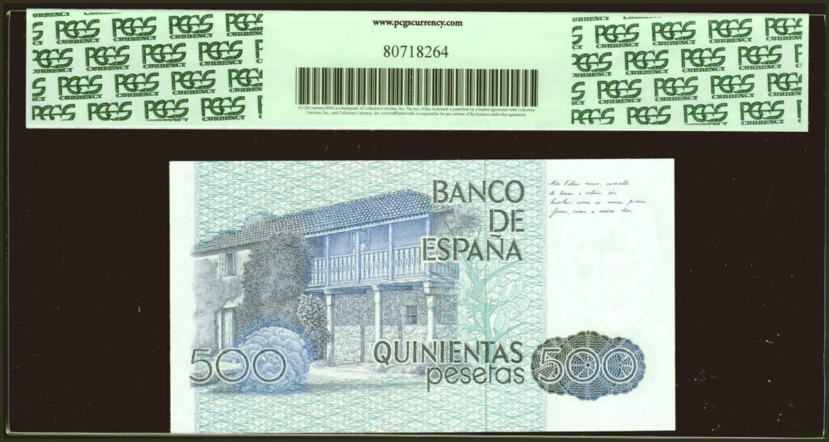 500 Pesetas. 23 de Octubre de 1979. Sin serie. (Edifil 2021: 476, Pick: 157). Inusual en esta calidad. SC. Encapsulado PCGS66PPQ.