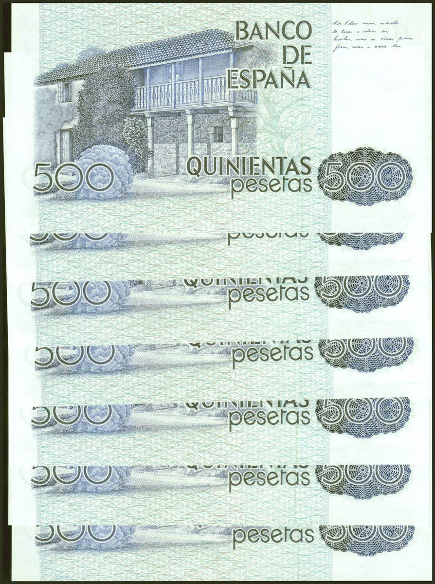 Conjunto de 7 billetes de 500 Pesetas emitidos el 23 de Octubre de 1979, todos ellos con la serie 1J. (Edifil 2021: 476a). SC/SC-.