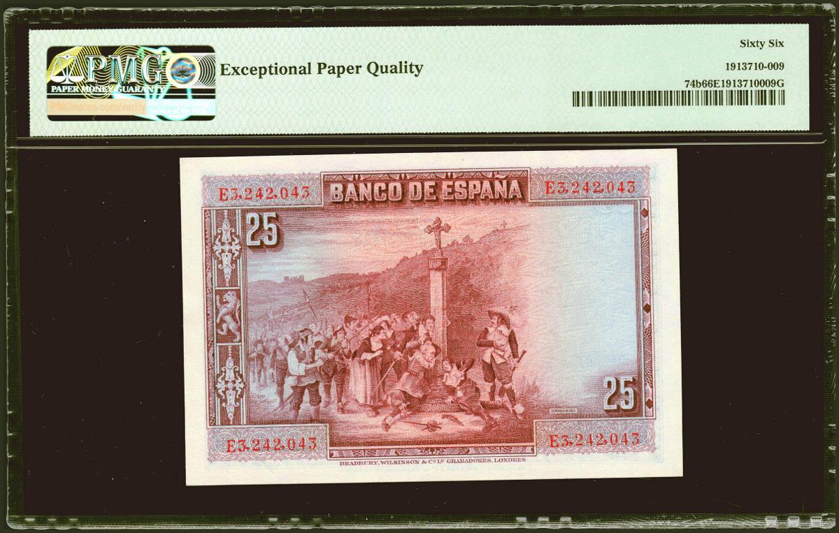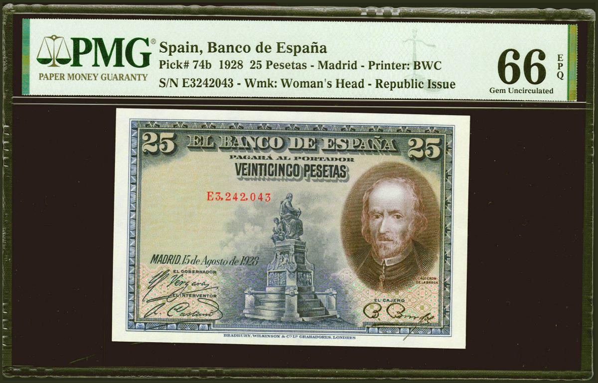 25 Pesetas. 15 de Agosto de 1928. Serie E. (Edifil 2021: 353, Pick: 74b). Raro en esta excepcional calidad, apresto original. SC. Encapsulado PMG66EPQ.