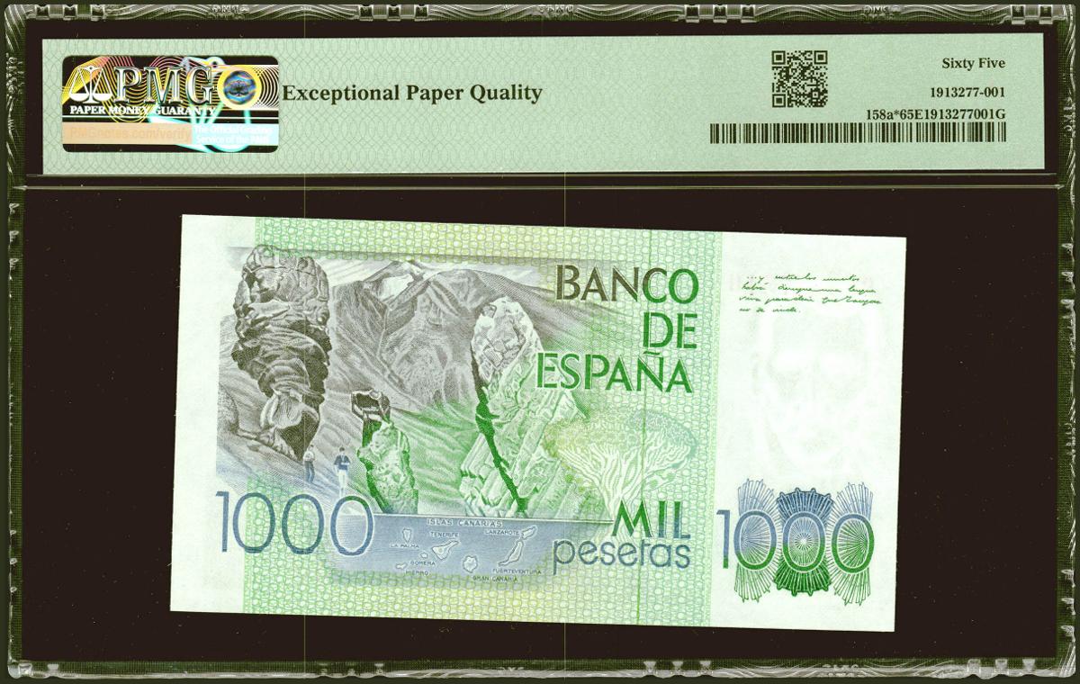 1000 Pesetas. 23 de Octubre de 1979. Serie especial 9E. (Edifil 2021: 477b, Pick: 158a*). Muy rara, serie especialmente en esta excepcional calidad, apresto original. SC. Encapsulado PMG65EPQ.