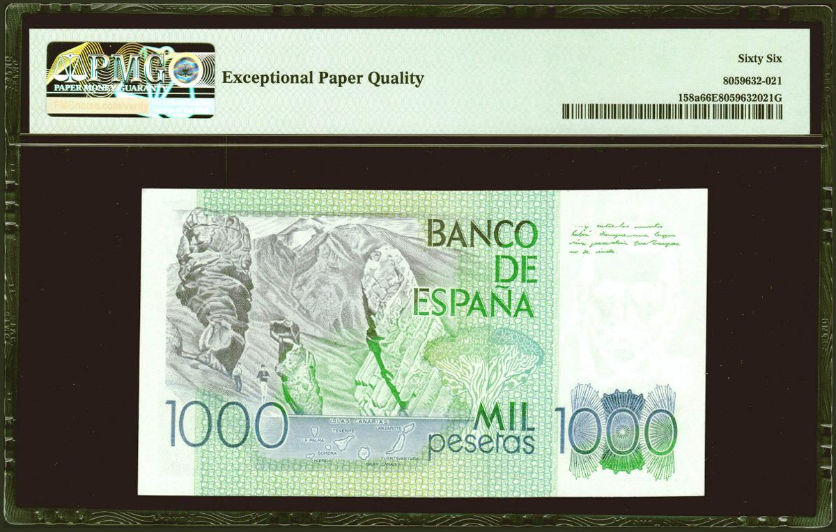 1000 Pesetas. 23 de Octubre de 1979. Sin serie. (Edifil 2021: 477, Pick: 158a). Inusual en esta excepcional calidad. SC. Encapsulado PMG66EPQ.