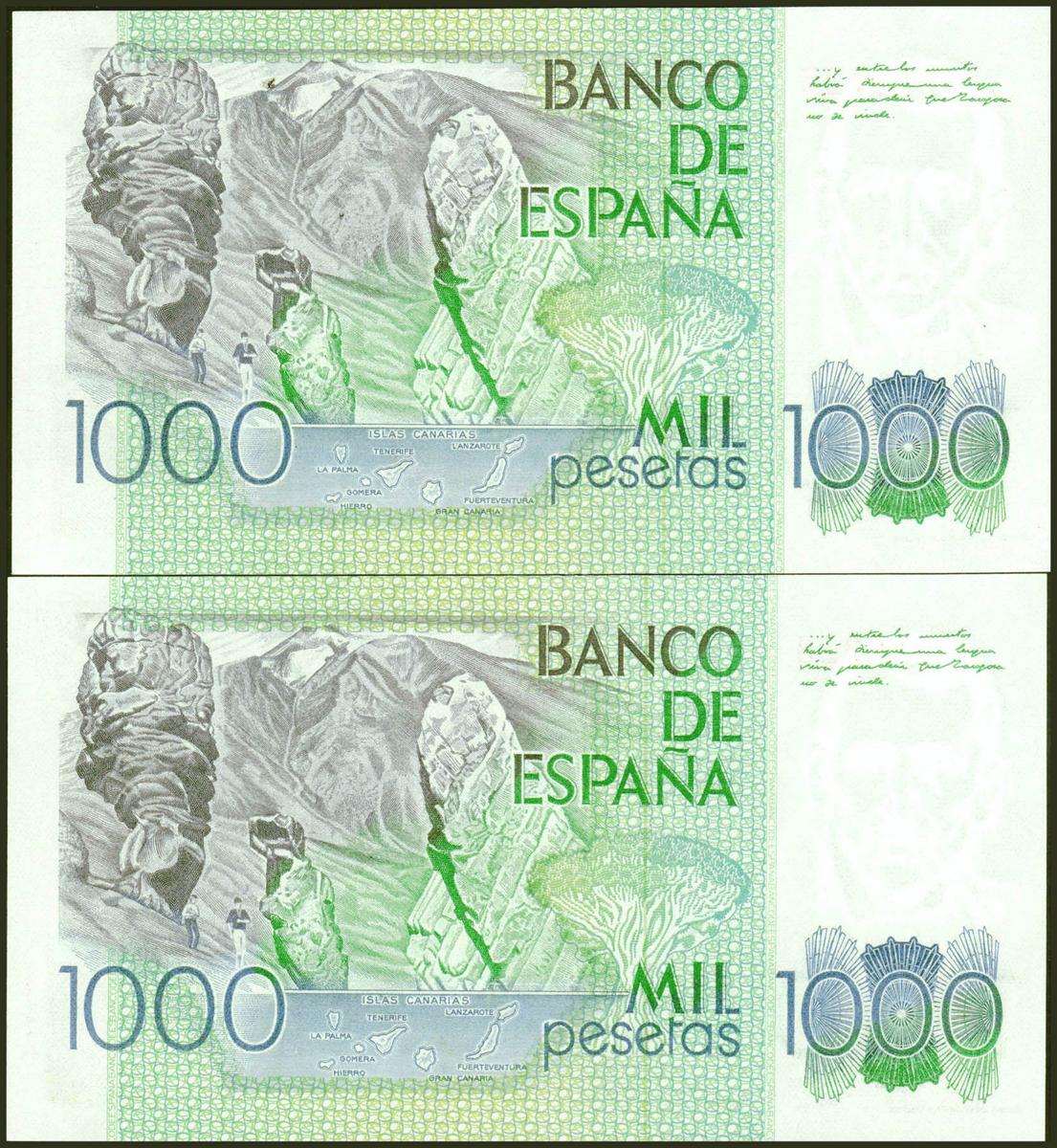 1000 Pesetas. 23 de Octubre de 1979. Pareja correlativa. Sin serie y numeración baja. (Edifil 2021: 477). SC-.